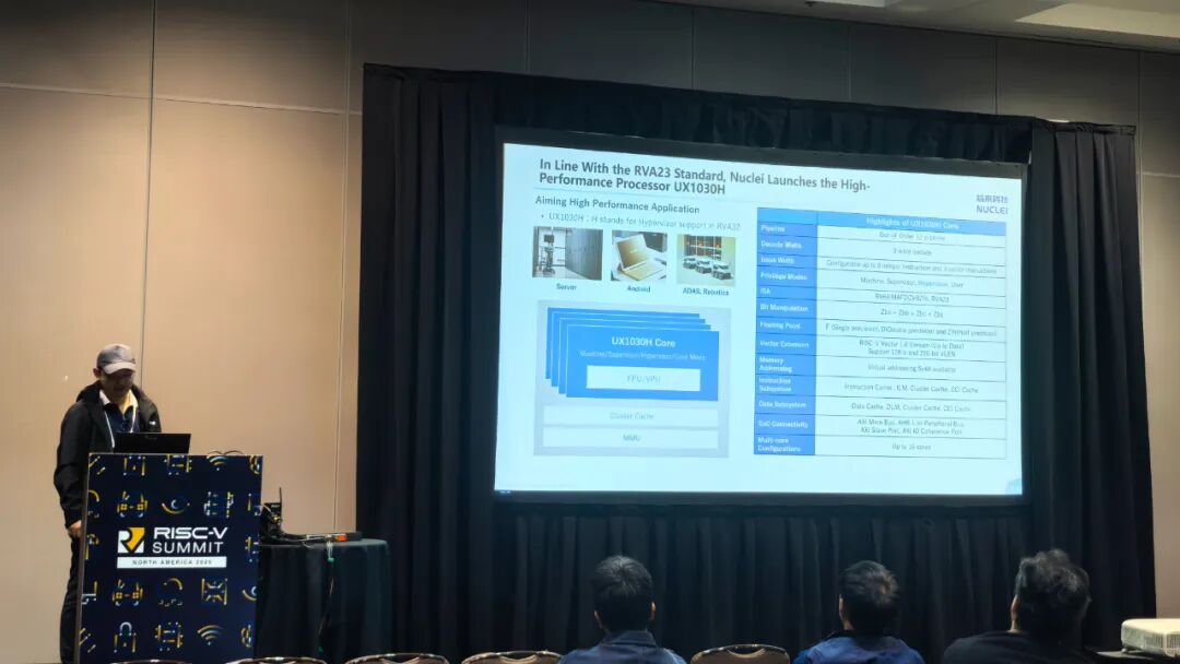 会上,芯来科技陈鹏博士进行了题为《Nuclei High Performance UX1030H with Full Support of RVA23》的演讲。陈博士介绍了芯来科技最新的处理器IP—UX1030H,它是全球首批完全符合RVA23标准的IP之一。UX1030H集成了矢量处理、乱序执行以及IOMMU和高级中断架构 (AIA) 等关键系统级功能,由此能够打造安全、可扩展且支持虚拟化的SoC。演讲中为大家分享UX1030H如何适用于实际应用,从Android平台到智能边缘系统,以及将其投入生产的方法;同时展示在KVM工具上运行的虚拟机的模拟演示,展示RISC-V虚拟化的实际进展。